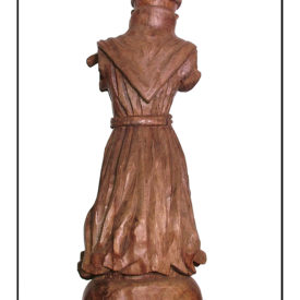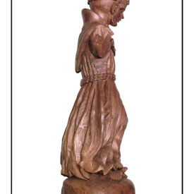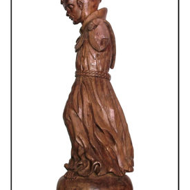 Figura masculina de pé, posição frontal e cabeça levemnete flexionada para baixo. Calva com mecha unica de cabelos caída na testa. O restante da cabeça é circundada pelo cabelo que deixa as orelhas a mostra. Ruga de expressão na testa e sombrancelhas esculpidas. Olhos voltado para baixo, boca cerrada e nariz aquilino. Perna esquerda levemente flexionada para frente. Cogula (túnica beneditina), presa com cordão duplo na cintura. Pés descalço levemente afastados. Parte de trás seguindo trabalho escultórico da frente com destaque para o capuz caído nas costas, e cinto atado à cintura franzindo a túnica. Base Arredondada.