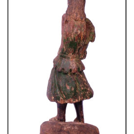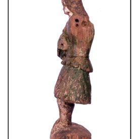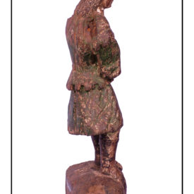 Figura masculina de pé na posição frontal. Cabelos longos caindo para trás em cachos. Sem o braço esquerdo e o direito levemente flexionado para frente, sem mão. Pernas retas em médio afastamento. Traja corpete verde com decote quadrado e barra com festonado estilizado, cinto em baixo relevo franzindo levemente o corpete à cintura. Saia curta com panejamento em pregas diagonais sugerindo movimento. Botas de cano longo com dedos à mostra. Base irregular. Parte de trás com marca