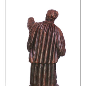 Figura masculina posição frontal e cabeça levemente voltada para direita e para baixo. Cabelos curtos com tonsura, barba e bigode, olhos abertos e boca fechada faltando o nariz. Braços flexionados, sendo o direito à frente na altura da cintura e o esquerdo elevado acima. Hábito com gola clerical, mangas longas, sobrepeliz e estola. Panejamento sugere figura em movimento. Pés calçados e separados. Parte de trás da escultura com panejamento drapejado com caimento reto. Base arredondada.