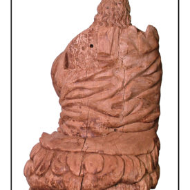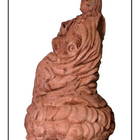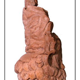 Figura feminina sentada com a cabeça voltada para cima. Cabelos longos repartidos ao meio mechas caindos por sobre os ombros e pelas costas. Olhos e bocas semi-abertos e fisionomia jovem. Braços flexionados e abertos. Túnica com mangas longas franzido na cintura por cinto. Manto preso nos ombros caindo por sobre as pernas formando panejamento farto com ondulações. Parte de trás seguindo mesmas caracteristicas esculturais da parte da frente, faltando uma parte. Base em forma de nuvem.