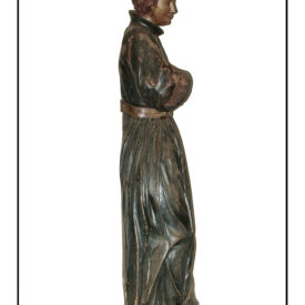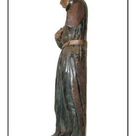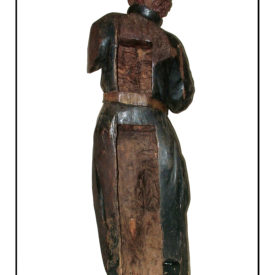 Figura masculina de pé na posição frontal com cabeça e corpo levemente inclinados para a direita. Cabelos curtos repartidos no lado direito caindo em mechas, ponta das orelhas a mostra, sobrancelhas arqueadas, olhos abertos, boca sorridente e pescoço curto. Falta braço esquerdo e direito flexionado junto ao peito. Mão direita sem os dedos. Perna direita levemente flexionada para frente e esquerda reta. Pés calçados separados e virados para fora. Traja batina preta franzida à cintura por cinto com fecho e gola clerical. Parte de trás com concavidade dividida em duas partes. A primeira vai da altura da axila até a cintura, acima da faixa do cinto e a segunda da cintura abaixo da linha do cinto até o final da escultura. Escultura sem base.