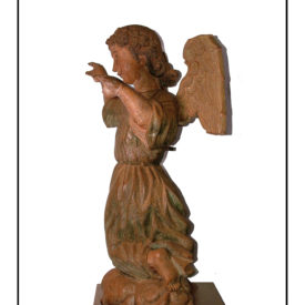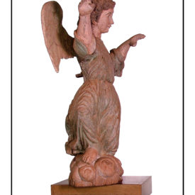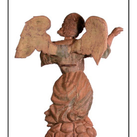 Figura em posição frontal. Cabeça levemente voltada para a esquerda, cabelos na nuca, caídos em mechas com as pontas encaracoladas. Sobrancelhas arqueadas, nariz aquilino, parte das orelhas a mostra. Pescoço longo e fino. Braços flexionados para os lados e para cima com as mãos soltas e espalmadas. Perna direita flexionada com pé voltado para fora e esquerda voltada para trás. Nas costas duas asas com quatro camadas de penas sobrepostas, e voltadas para baixo. Túnica franzida na cintura com decote e golas arredondadas, sendo que a última é bipartida formando babado, e mangas largas caídas na altura do cotovelo. Na parte de trás, às asas são lisas e estão unidas por placa de metal. O restante segue padrão escultórico da parte da frente, com panejamento da túnica esvoaçante. Pés