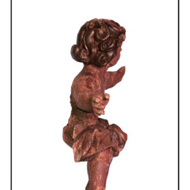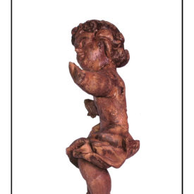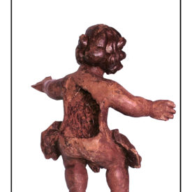 Figura infantil em posição frontal, com cabeça voltada para a esquerda e para cima. Cabelos curtos em mechas com as pontas encaracoladas. Sobrancelhas arqueadas, olhos abertos nariz achatado, boca cerrada e pescoço grosso e curto. Corpo coberto por panejamento na altura da cintura. Braços abertos para os lados com a mão espalmadas. Umbigo aparente em ponto. Pernas flexionadas como se a figura estivesse sentada. Pés descalços. Na parte de trás destaque para aréa onde deveriam estar fixadas as asas, côncavo sem tampa logo abaixo das asas e panejamento que envolve a cintura não vai até as nádegas da escultura.