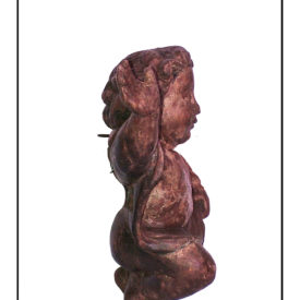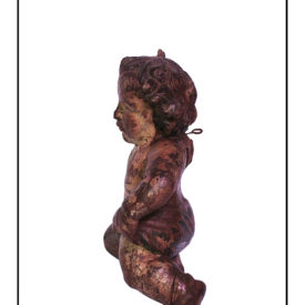 Figura infantil em posição frontal com a cabeça levemente voltada para esquerda. Cabelos curtos e encaracolados, sobrancelhas arqueadas, olhos abertos, nariz achatado, boca cerrada. Corpo seminu com tanga cujo panejamento tem ponta pendurada no braço direito. Braços flexionado sendo o direito para o lado e para cima e o esquerdo para baixo e para a esquerda segurando o panejamento da tanga. Ventre protuberante com umbigo aparente. Pernas flexionadas, voltadas para o lado esquerdo e pés descalços. Na parte de trás gancho de metal aposto para fixação na parede, locais das asas com preenchimento.