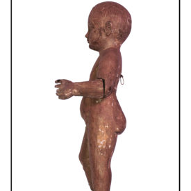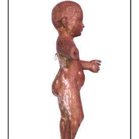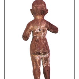 Figura de menino de pé na posição frontal. Cabelos curtos deixando orelhas a mostra, olhos abertos, nariz pequeno e arrebitado, boca cerrada. Braço esquerdo lexionado para frente com a mão aberta sem os dedos. Braço direito também flexionado para cima, mas sem o antebraço. Corpo nu, ventre protuberante com umbigo aparente, nádegas arredondadas, sexo esculpido. Perna direita levemente flexionada e esquerda reta. Sem os pés a partir dos calcanhares.