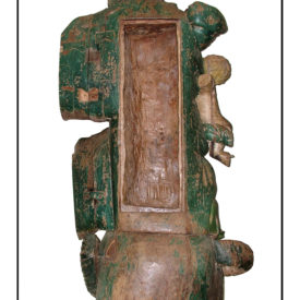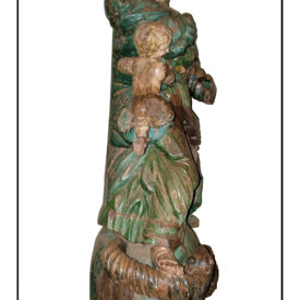 Figura feminina de pé em posição frontal. Cabeça levemente voltada para cima. Olhar voltado para cima, sobrancelha reta, nariz aquilino, boca entreaberta oca e com os dentes esculpidos. Cabelos longos e soltos, caídos por sobre os ombros de forma a sugerir que eles estão semi-presos na altura final do pescoço e cobertos por touca de flores. Pescoço longo e fino. Braço direito flexionado em direção ao peito e o esquerdo flexionado para frente, ambos sem as mãos. Perna direita flexionada para frente e para o lado direito, pé aparente calçando sandália e apoiado no corpo da serpente que envolve a bzse. Perna esquerda sugere flexão para a parte de trás como se apoiasse o joelho em parte não mais existente da escultura. Traja túnica longa verde com decote redondo circundado por tarja amarela e franzida por cinto de cor amarela atado por nó na parte frontal. Na barra da túnica acabamento em relevo formando tarja da mesma cor da túnica. Manto caindo das costas por sobre os ombros, formando panejamento farto e volumoso em tom de verde mais escuro que o da túnica. No lado direito da imagem