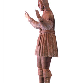 Figura masculina de pé na posição frontal com a cabeça levemente inclinada para baixo. Cabelos longos caídos em estrias e repartidos ao meio. Sobrancelhas arqueadas, olhos abertos, nariz aquilino, boca cerrada, bigode e barba. Braços abertos e flexionados para os lados. Traja casaco até a altura do joelho, aberto na frente com fechamento feito por sete botões e franzido á cintura por cinto com meio laço e caindo em duas pontas. Barra reta e gola redonda repartida ao centro. Bragas com quatro botões laterais. Pés calçados por botas com orla virada. Sem a metade dos pés e base.