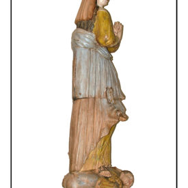 Figura feminina de pé na posição frontal. Cabelos longos repartidos ao meio e caindo por sobre as costas cobertos por véu na cor vermelha. Sobrancelhas arqueadas, olhos abertos, nariz aquilino, orelhas a mostra, boca pequena e cerrada. Braços flexionados junto ao corpo em posição de prece. Perna direita levemente flexionada para frente e esquerda reta. Pés em médio afastamento calçando sandálias, com dedos aparentes. Túnica longa na cor amarela com mangas ajustadas ao corpo. Decoração fitomorfa nas cores verde e vermelha. Gola drapeada na cor branca. Manto preso à cintura na cor azul, deixando a mostra do lado esquerdo ponta esvoaçante com verso na cor branca. Base em formato de nuvem com três querubins e espaço que sugere a existência de um quarto, todos deitados. Querubins de cabelos curtos em mechas, olhos abertos e boca entraberta, colar com pontas arredondadas e duas asas com penas voltadas para baixo. Parte de trás com côncavo iniciado na altura da cintura até aproximadamente 10 cm antes do fim da túnica, coberto por tampa formada por duas peças que seguem o estilo escultórico da túnica.