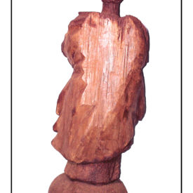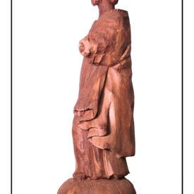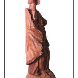 Figura Masculina de pé, posição frontal com cabeça levemente voltada para a esquerda. Sem rosto e braços, sendo que o direito na totalidade e o esquerdo em parte. Pernas levemente afastadas. Direita reta e esquerda levemente flexionada para a frente. Túnica longa com decote arredondado, franzida por cinto em forma de corda. Manto esvoaçante presa à túnica na altura dos ombros. Base arredondada. Parte de trás com pouco trabalho escultural sendo que parte está reta sugerindo retirada posterior devido ao ataque de térmitas.