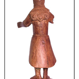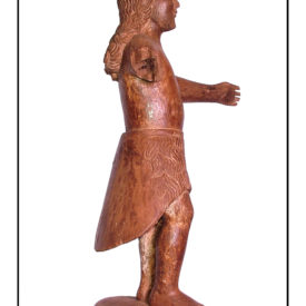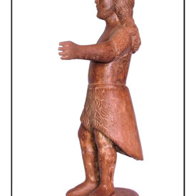 Figura masculina de pé na posição frontal. Cabelos longos caídos nas costas, com as pntas encaracoladas. Sobrancelhas arqueadas, olhos abertos, nariz aquilino, boca cerrada, barba e bigode. Braços flexionados e abertos, faltando o direito e parte dos dedos da mão esquerda. Pernas próximas, sendo que a direita se encontra levemente flexionada para frente. Joelhos à mostra. Traja saiote com aparência de pele de animal, de pontas irregulares e curtas na região frontal e mais longa na parte de trás. Pés descalços em médio afastamento e levemente voltados para fora. Parte de trás com trabalho escultórico apenas nos cabelos e no volume do saiote. Base arredondada