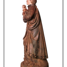 Figura masculina, de pé na posição frontal, cabeça levemente voltada para cima. Cabelo curto e estriado, orelhas a mostra, sobrancelhas arqueadas, olhos abertos, nariz aquilino, boca pequena e cerrada. Braços flexionados, segurando nas mãos, menino sentado sobre a mão direita com os pés apoiados na mão esquerda. Pernas retas, batina preta com gola clerical, manto longo por cima, caído nas costas com uma ponta presa sob o braço esquerdo. O manto apresenta barrado com decorações fitomorfas. Panejamento farto sugerindo movimento caindo dobrada por sobre os pés da imagem, que é menor que a roupa, deixando à mostra o pé esquerdo com sapato. Menino sentado de perfil, cabelos curtos, estriados e encaracolados nas pontas e abaixo das orelhas. Olhos abertos, nariz achatado e boca