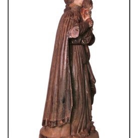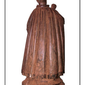 fechada. Parte de trás com manto caindo por sobre as costas formando pregas retas. Base arredondada
