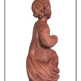 Fragmento de escultura. Figura infantil sentada sobre braço direito, com o corpo voltado para o lado esquerdo. Cabeça levemente voltada para cima, cabelos curtos e encaracolados, olhos abertos com o olhar voltado para cima, boca semi-aberta e sorridente. Braços flexionados, direito em direção ao peito e esquerdo para o lado e voltado para cima. Pernas flexionadas na posição de sentar com os pés descalços apoiados no volume do panejamento que lhe serve como base. Traja túnica longa